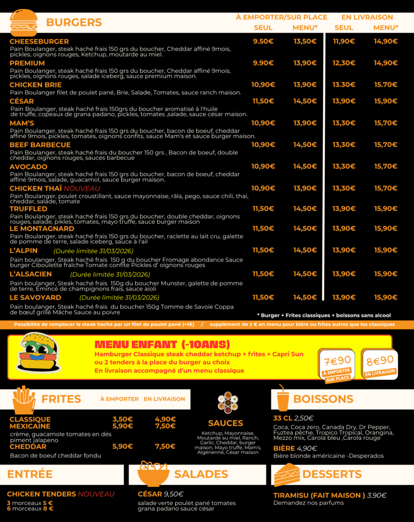 * Burger + Frites classiques + boissons sans alcool