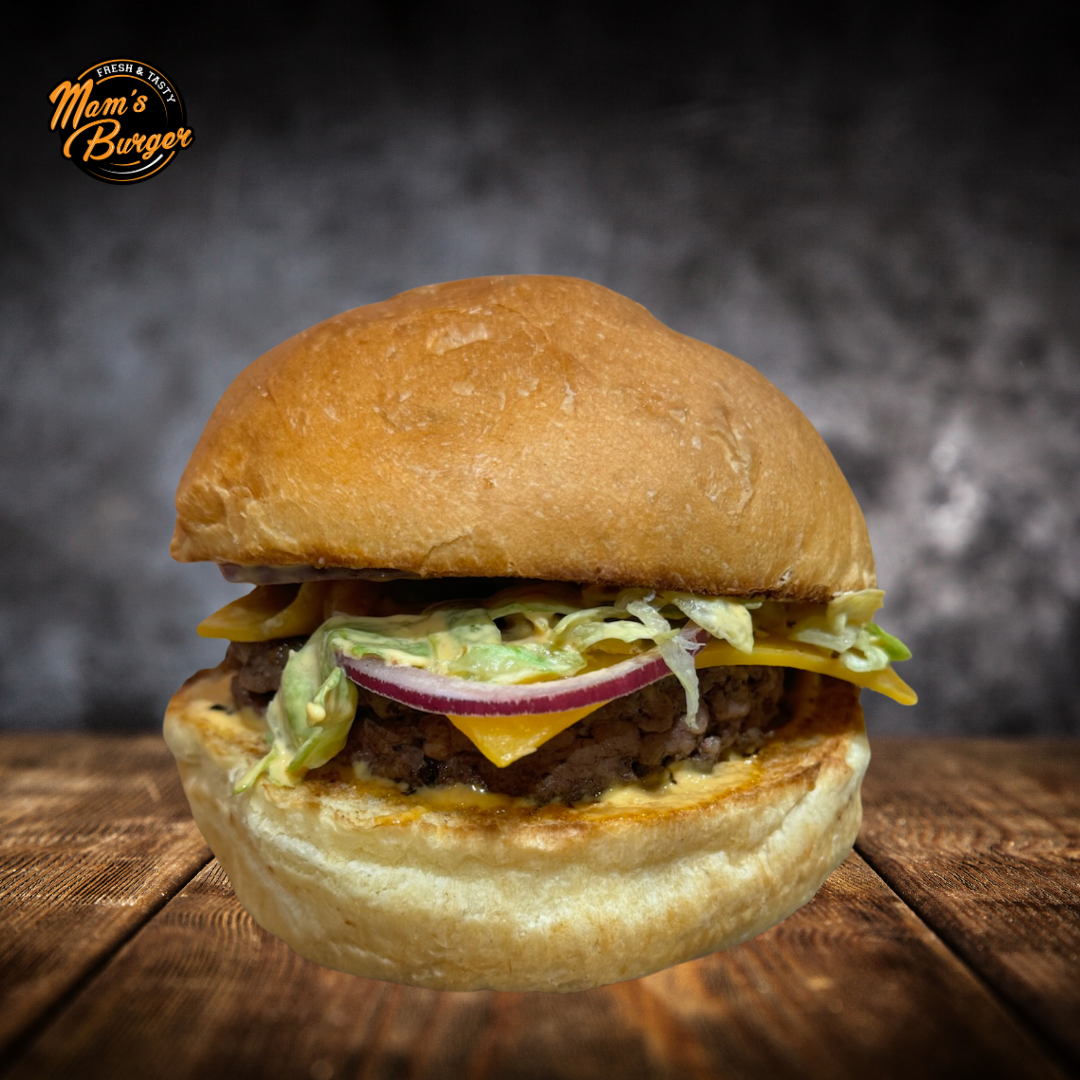 Pain boulanger, Steak haché frais 150 g du boucher Fromage abondance Sauce burger Ciboulette fraîche Tomate confite Pickles d’ oignons rouges.